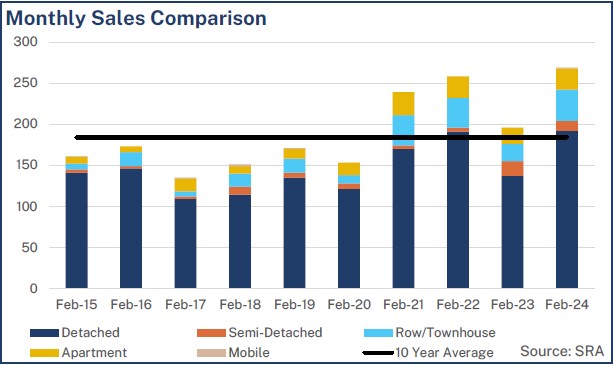 The City of Regina reported 273 sales in February, a year-over-year gain of over 33 per cent and nearly 50 per cent above long-term trends.