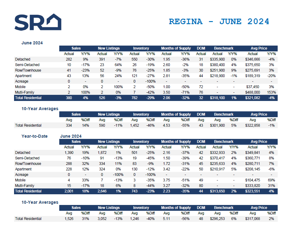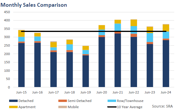 The City of Regina reported 380 sales in June, up four per cent year-over-year and 14 per cent above long-term, 10-year trends.