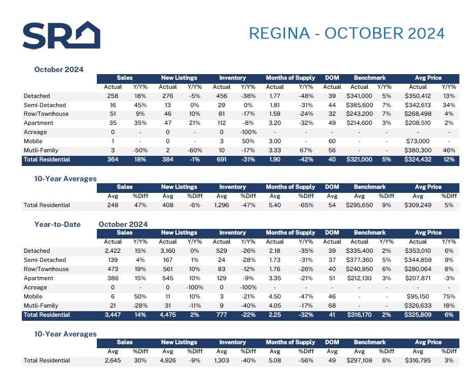 The City of Regina reported 364 sales in October, an increase of 18 percent year-over-year and 47 percent above long-term, 10-year trends. Further sales gains in October contributed to 3,447 year-to-date sales, the highest year-to-date sales figure ever reported through October in the Queen City.